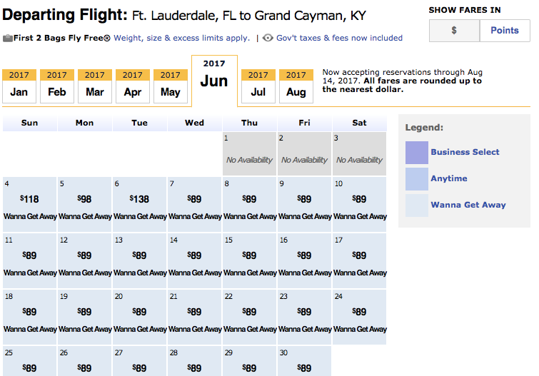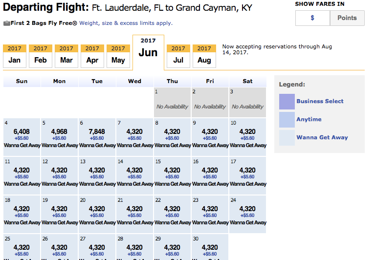 Prices to Grand Cayman thus far start at about $89 each way or 4,320 Southwest points + taxes/fees from Fort Lauderdale.