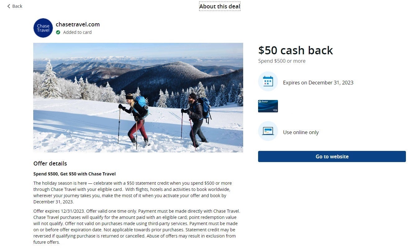Now through the end of 2023, cardholders who are eligible for this targeted offer can earn $50 cash back after spending $500 through the Chase Travel portal.