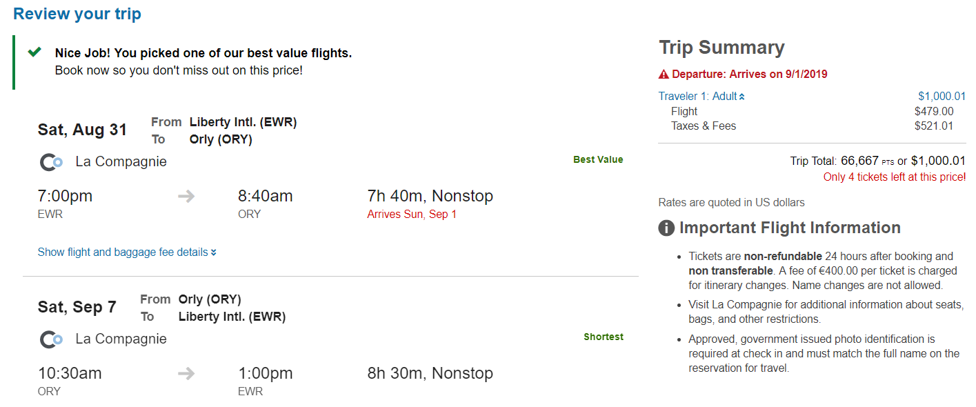 These are promotional fares that come with some restrictions — La Compagnie says the fare is not refundable and carriers a $500 penalty fee per changed flight.