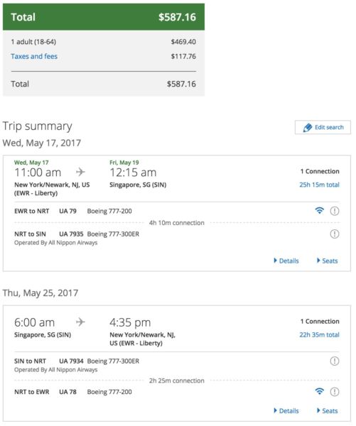 Newark (EWR) to Singapore (SIN) for $587 round-trip in May 2017: