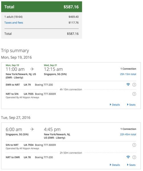 Singapore is just about as far as you can get from the East Coast. The city makes for a great starting point for vacations to Southeast Asia, and other destinations in the region. Right now, United is offering terrific deals for one-stop service from Newark (EWR) to Singapore (SIN), with round-trip flights available starting at just $587. It looks like United is matching fares after Delta dropped its prices at the end of August. The deal is good from September through June 2017. Note that you'll have to make a stop in Tokyo (NRT) each way, with the NRT - SIN leg operated by ANA and can earn 21,200 PQMs with United.