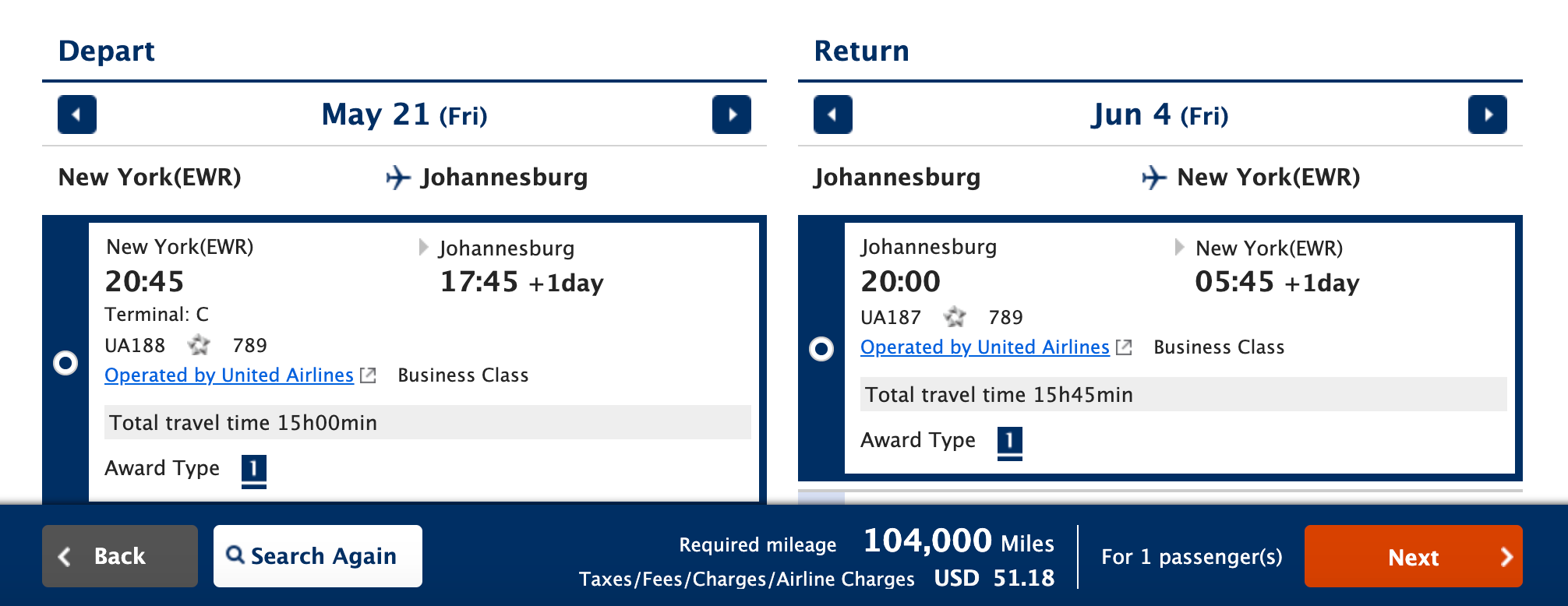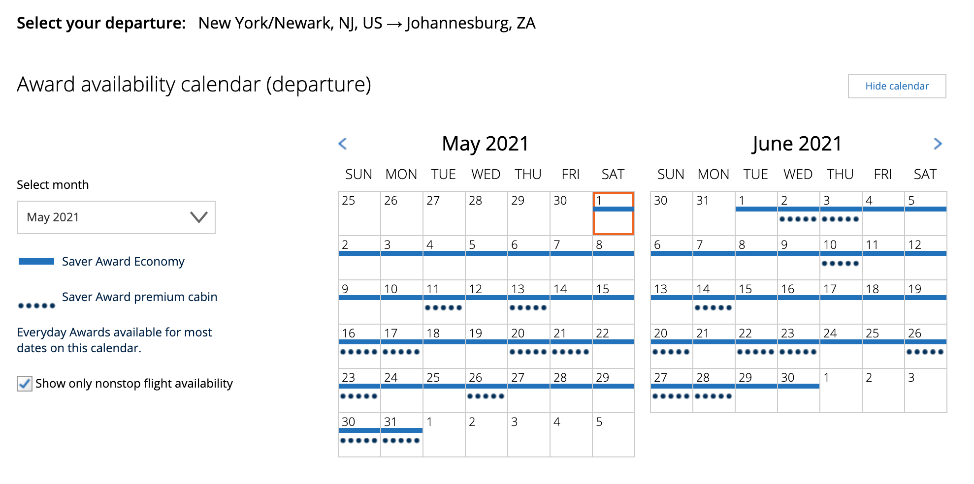 Let's start with flights from the U.S. to South Africa. At the time of writing, here's a look at the dates with two award seats from Newark to Johannesburg in business class for May and June of 2021 (only two dates in April are available):
