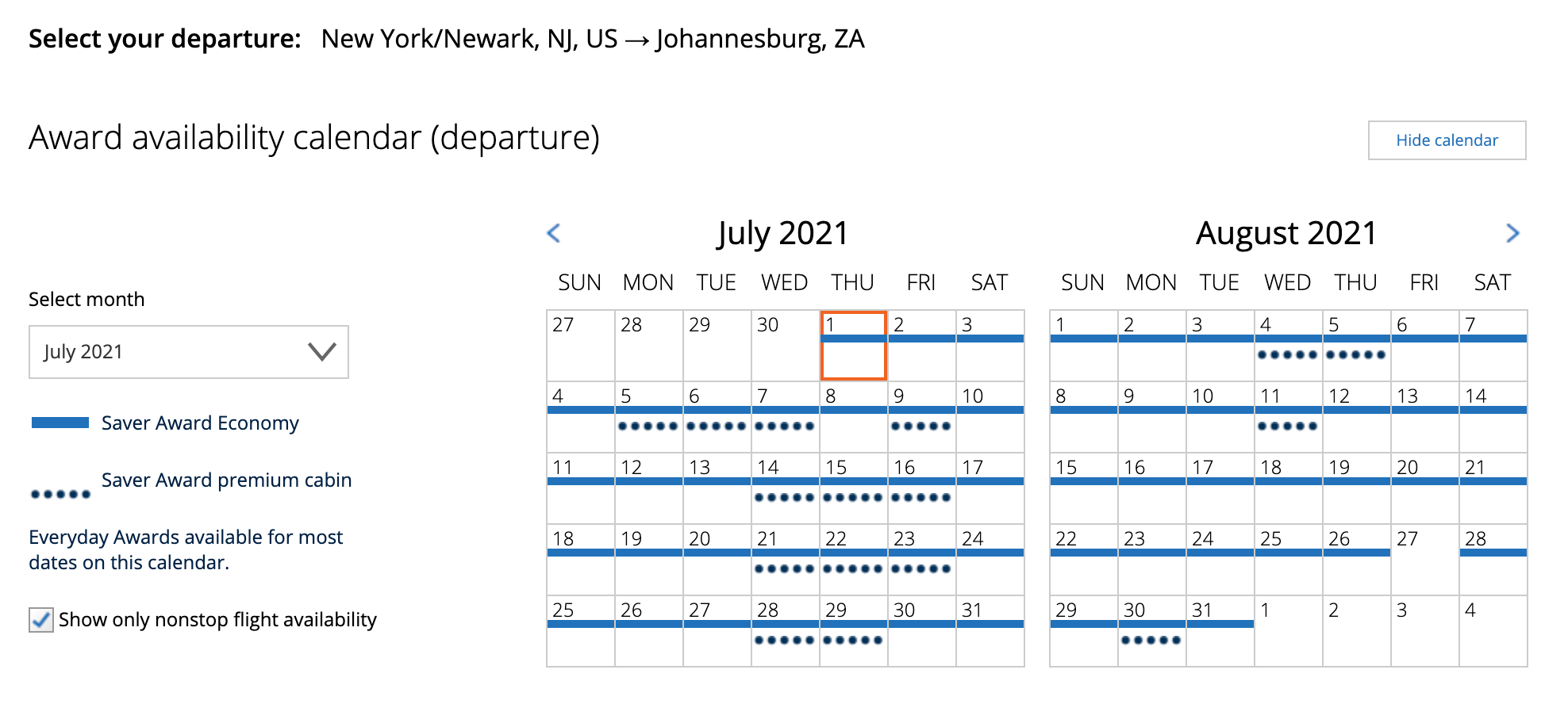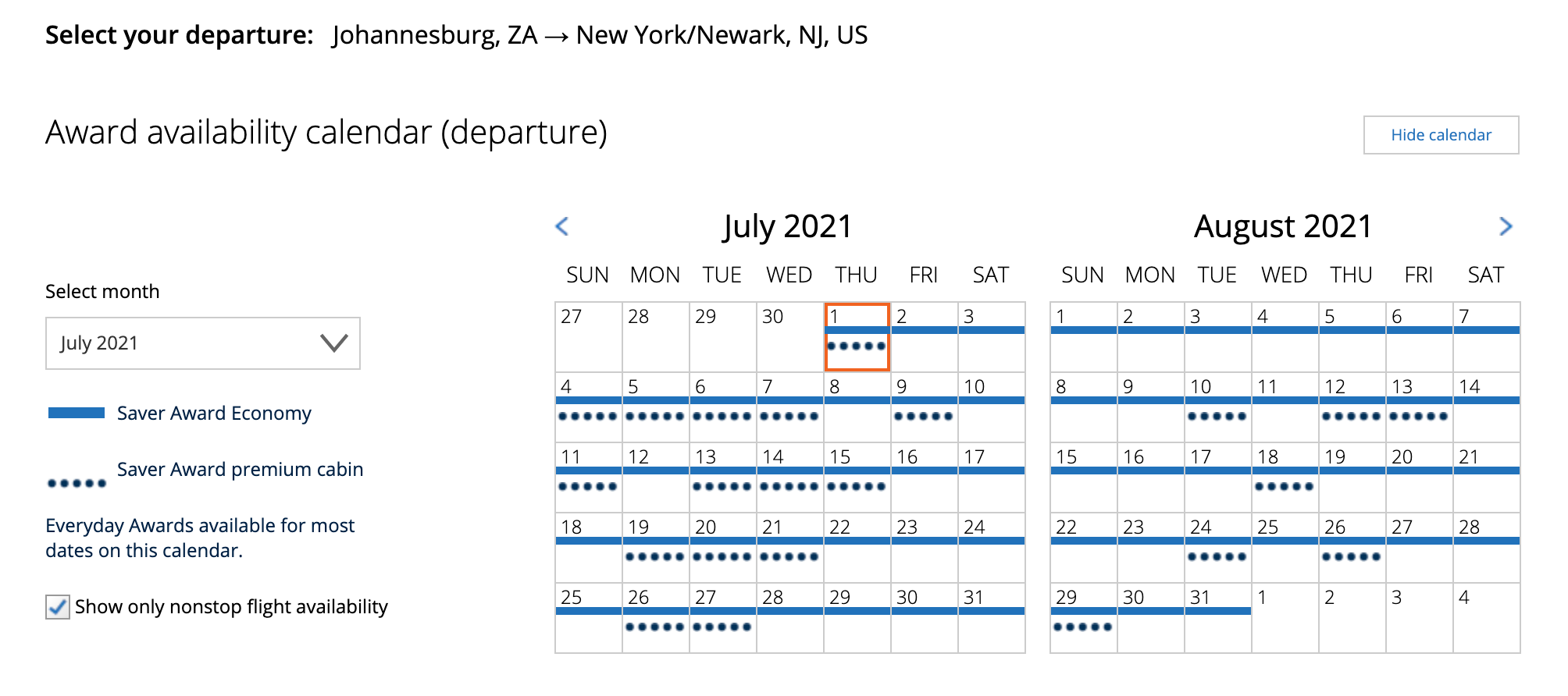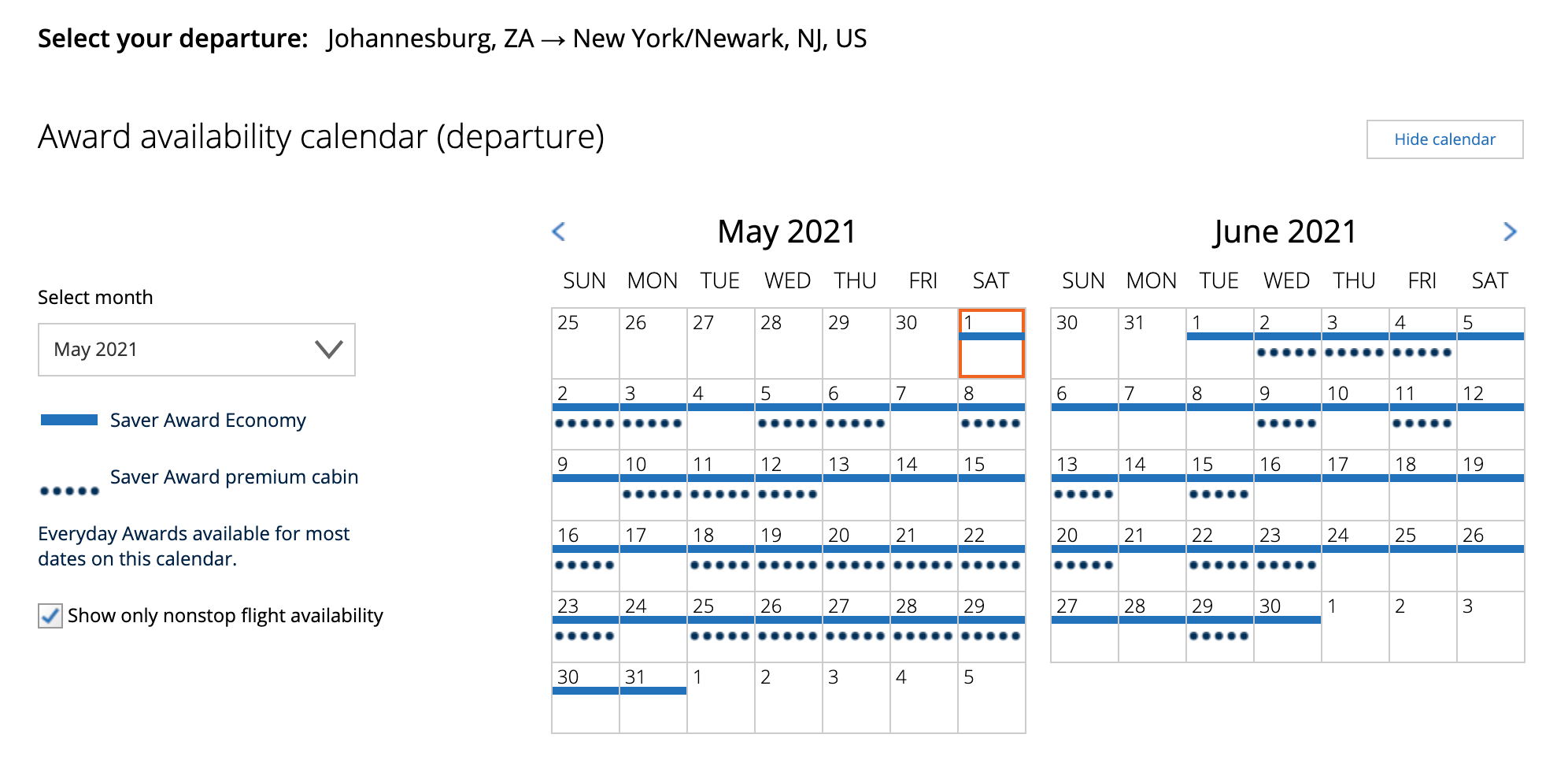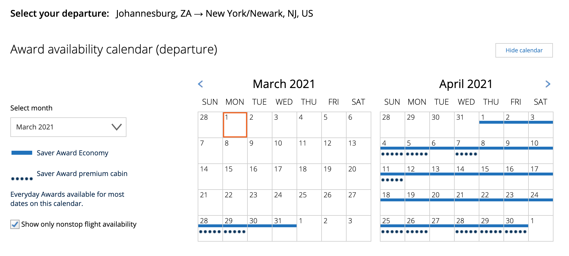 On the return trip, it's an even better story. Here's the calendar with nonstop, business-class awards from Johannesburg to Newark in March and April 2021: