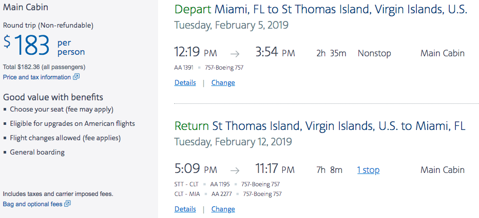 Miami (MIA) to St Thomas (STT) for $183 round-trip on American:
