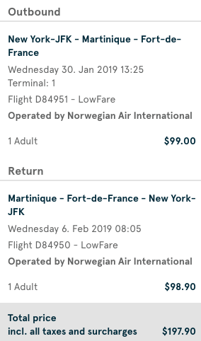 New York (JFK) to Fort-de-France (FDF) for $198 round-trip nonstop on Norwegian: