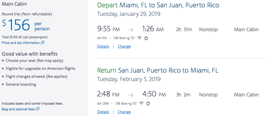 Miami (MIA) to San Juan (SJU) for $155 round-trip nonstop on American in Main Cabin (not basic economy):