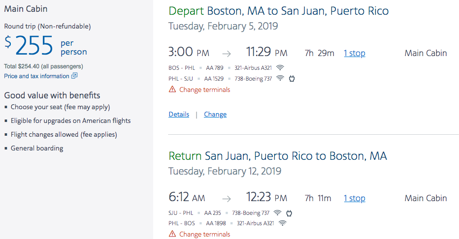 Boston (BOS) to San Juan (SJU) for $254 round-trip on American in Main Cabin (not basic economy):