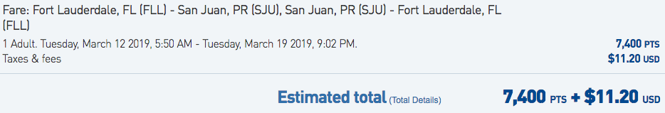 Fort Lauderdale (FLL) to San Juan (SJU) for 7,400 JetBlue points + $11 round-trip nonstop on JetBlue: