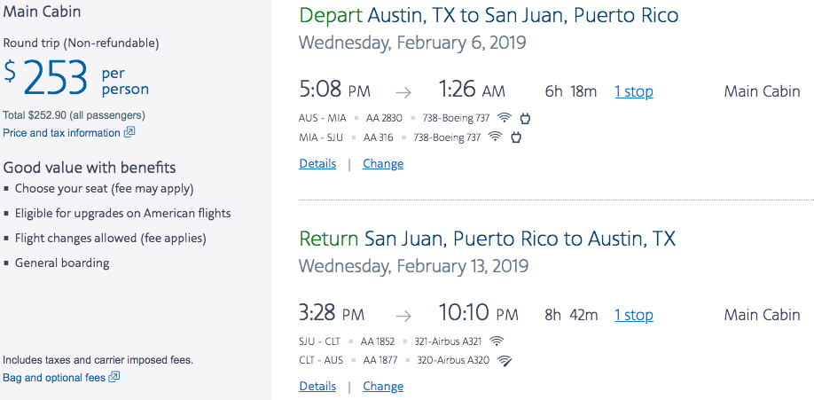 Austin (AUS) to San Juan (SJU) for $253 round-trip on American in Main Cabin (not basic economy):