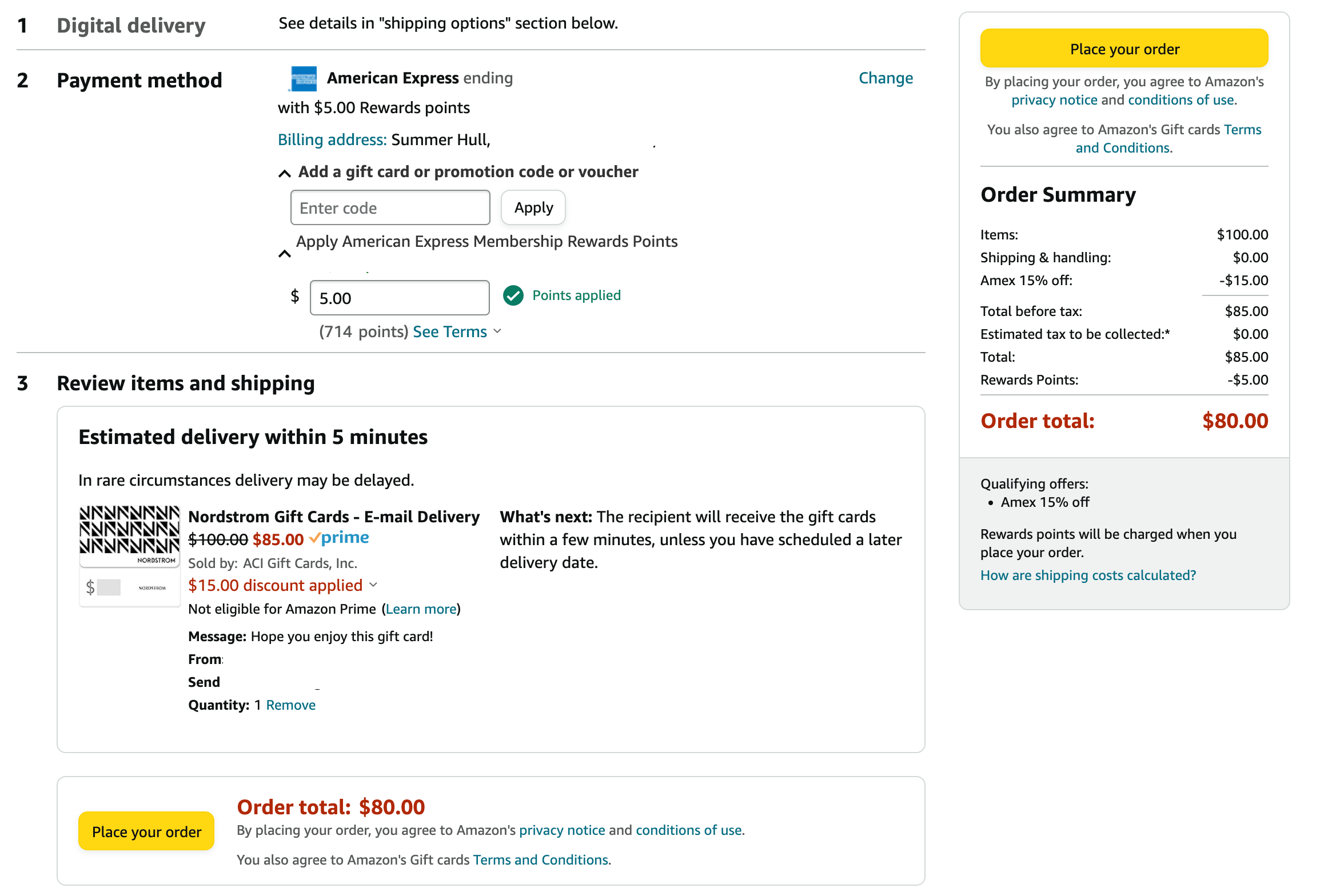 You can potentially purchase Nordstrom gift cards for less on Amazon by leveraging some of the available offers that give you a discount on Amazon purchases for using a few credit card points.