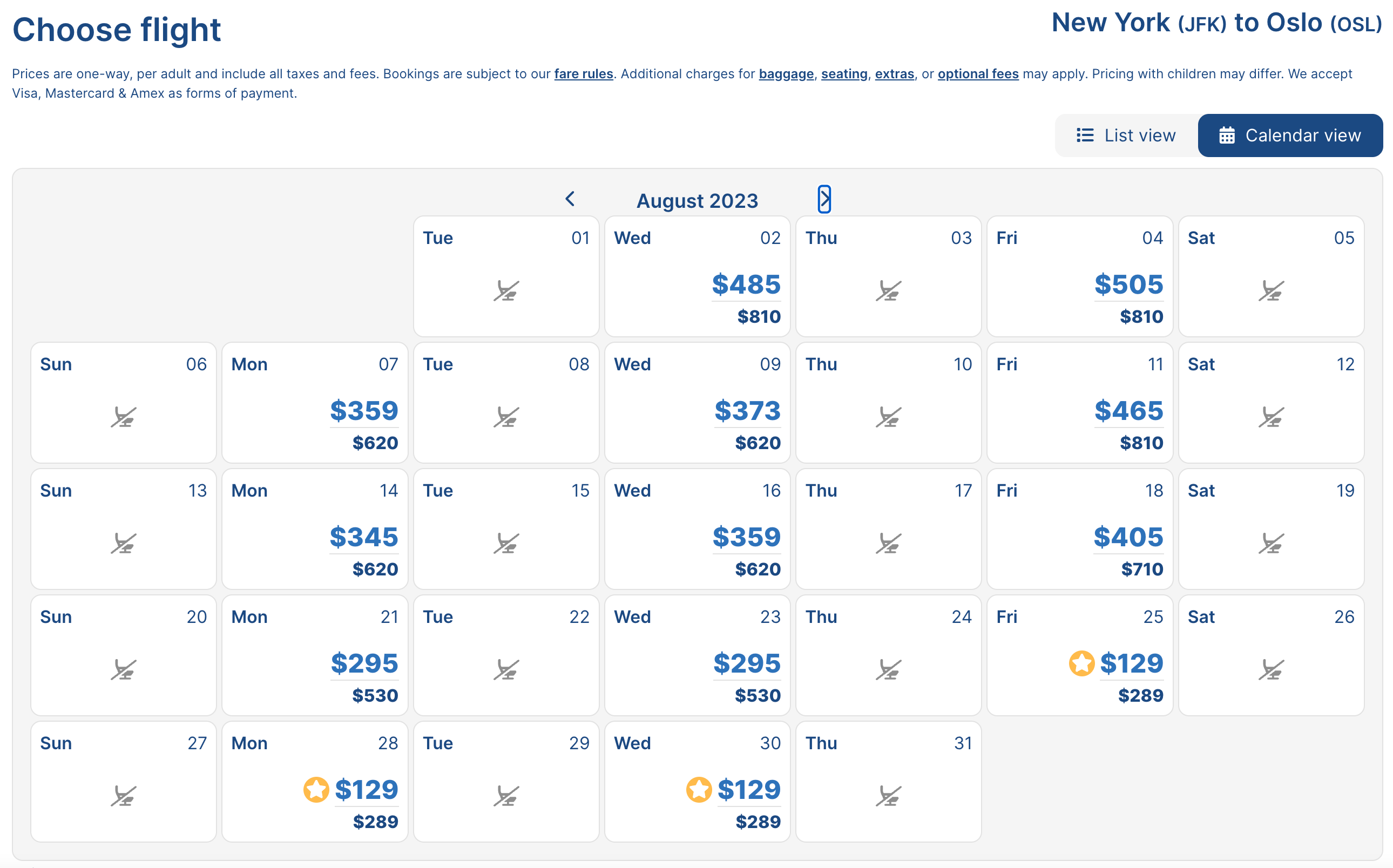 To identify when the advertised fares are available, use the airline's calendar view if your travel dates are flexible. For example, the aforementioned $129 flights from JFK to OSL are available in late August, per the calendar.