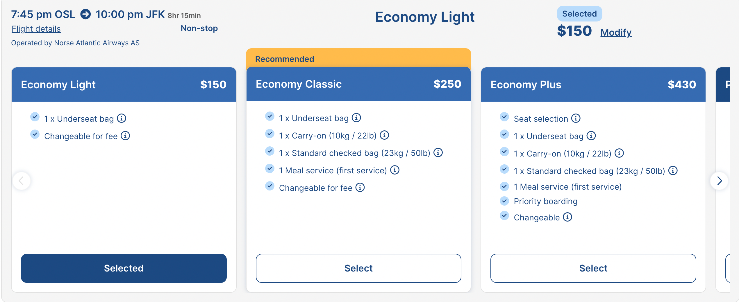 These fares are for Norse Atlantic's Economy Light fare, which does not come with a lot of perks. Passengers booking Economy Light fares only get a personal item and can make changes to their ticket with a fee.