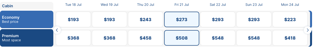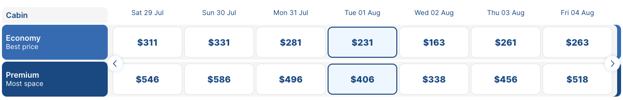 You can now book to fly between the metropolises from the end of June until mid-July (minus any additional baggage and extras) for as little as $533 round-trip. Just take a look at these prices — even bumping yourself up to a premium seat isn't all that eye-watering either.