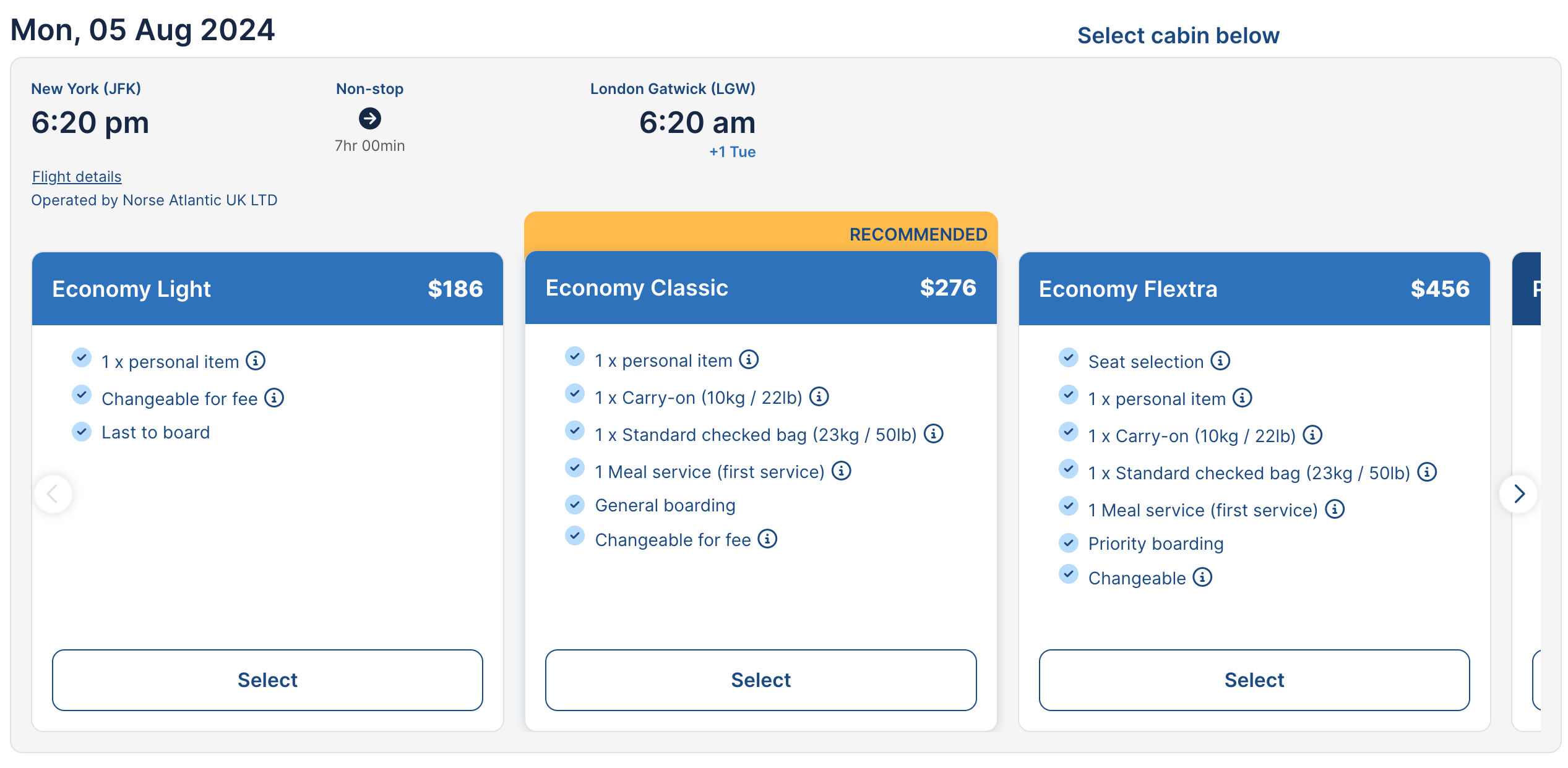 Norse's cheapest fares are in the Economy Light class, which only allows travelers to bring one personal item that can fit underneath the seat in front of them. Factor in an additional $45 for full-size carry-on items and $60 for entry-level checked bags.