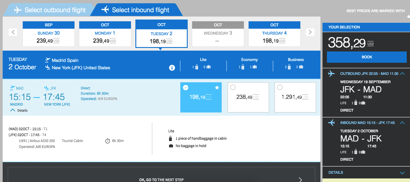 New York (JFK) to Madrid (MAD) for $358 round-trip in October on Air Europa in basic economy: