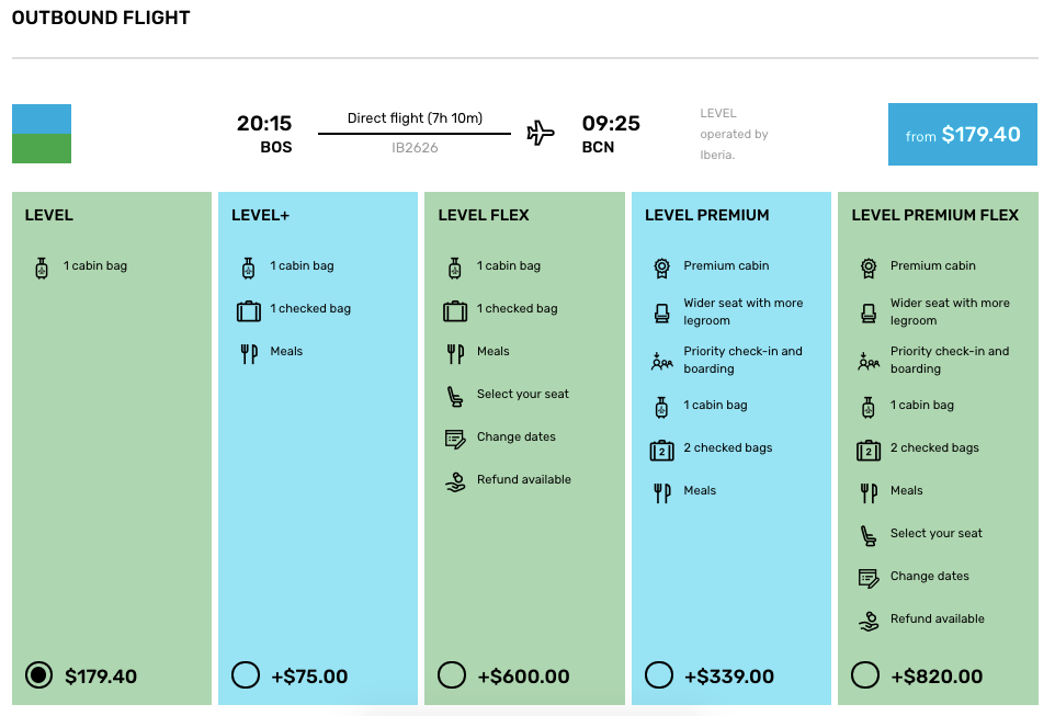 Boston (BOS) to Barcelona (BCN) for $361 round-trip in October on LEVEL (each leg booked separately):