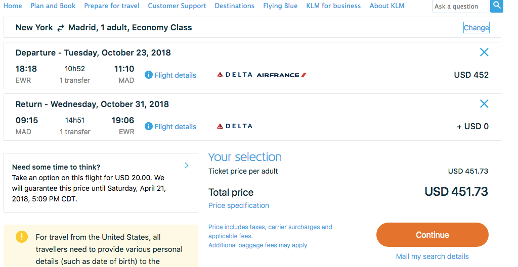 Newark (EWR) to Madrid (MAD) for $452 in October on Delta/KLM in regular economy:
