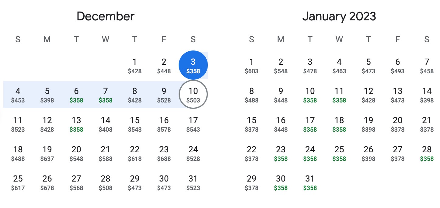First, we search Google Flights to make sure we're booking a day that this deal applies to. There are a fair number of blackout dates.