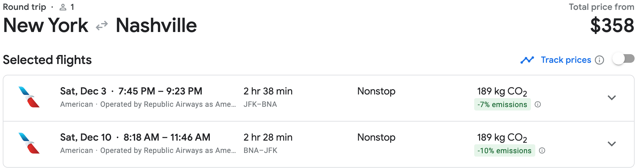 For this article, we'll take a look at an American flight from JFK to Nashville International Airport (BNA) which departs Dec. 3 and returns Dec. 10. It costs $358 round-trip: