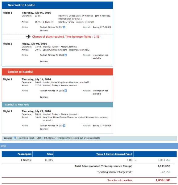 New York (JFK) to London (LHR) and Istanbul (IST) for $1,856 in Turkish business class.