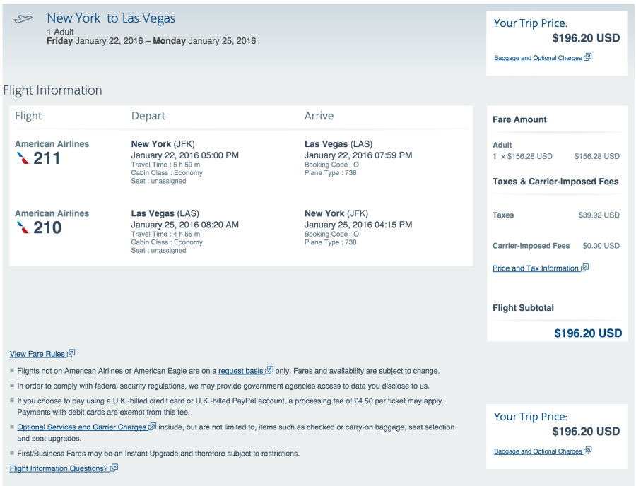 New York (JFK) to Las Vegas (LAS) for $196 on American (earns 4,496 EQMs):