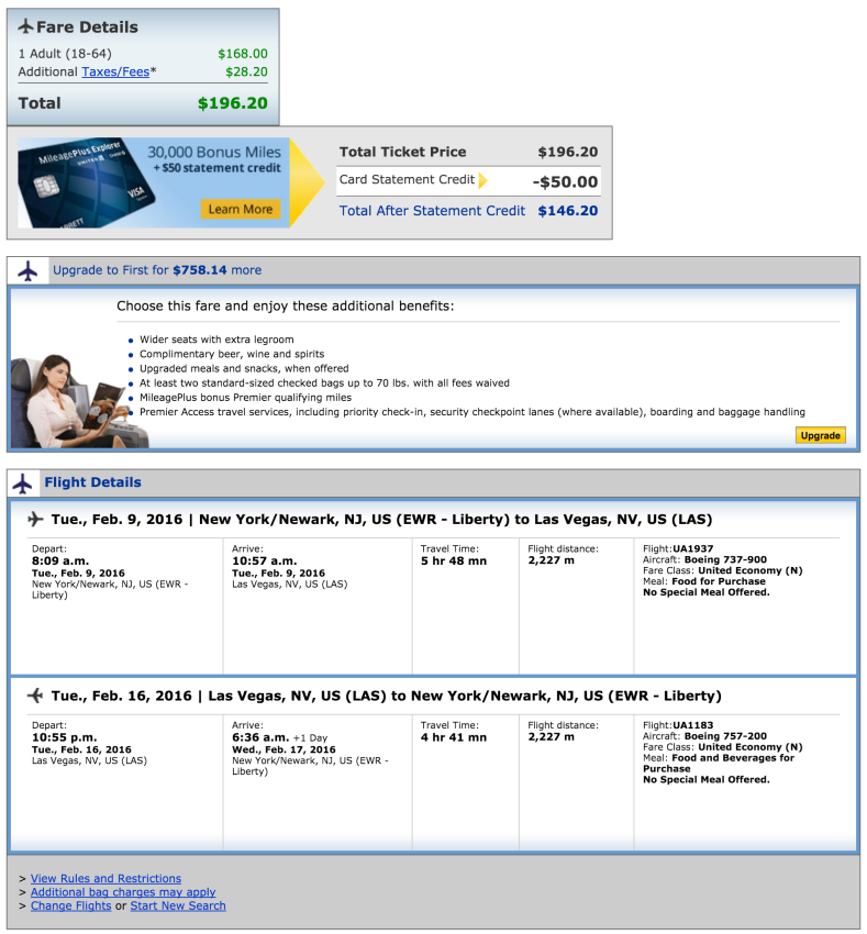 Newark (EWR) to Las Vegas (LAS) for $196 on United (earns 4,454 PQMs):