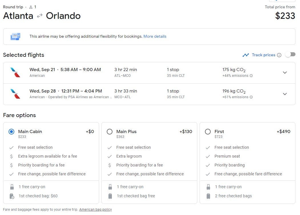 Travelers can fly from Atlanta (ATL) to Orlando (MCO) for $233 round trip. This offer also includes short stops in Charlotte (CLT) each way.