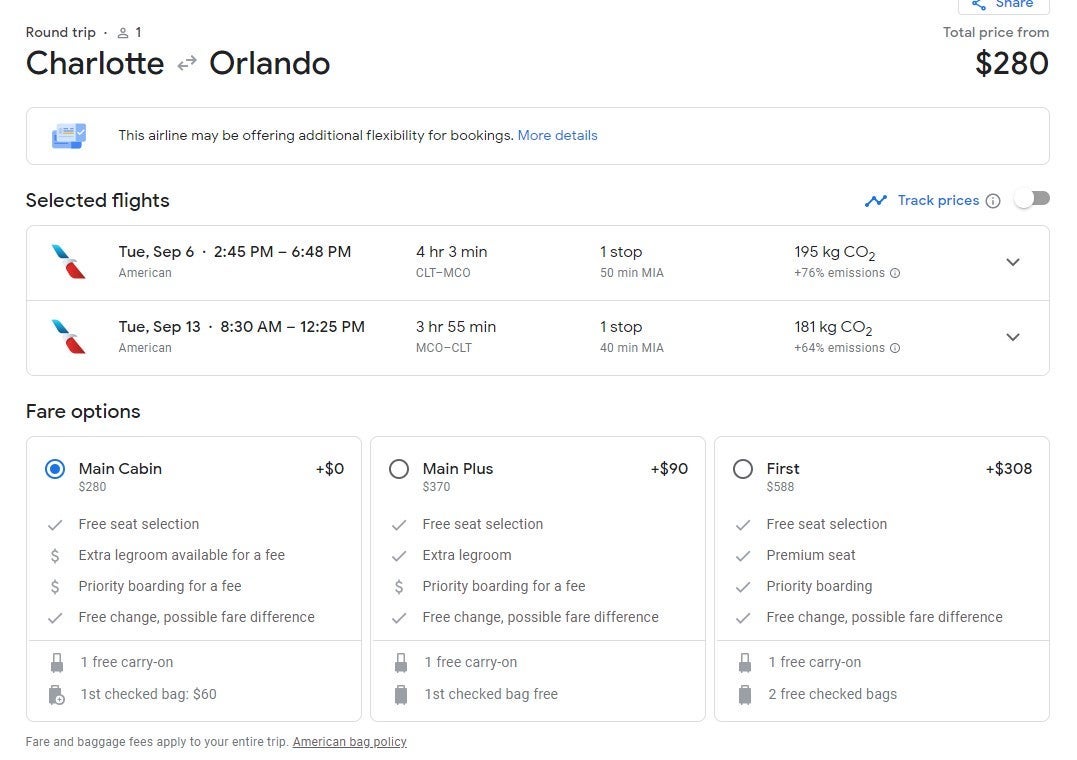 For $280 round trip, you can fly from Charlotte (CLT) to Orlando (MCO). The deal below includes quick connections in Miami (MIA).