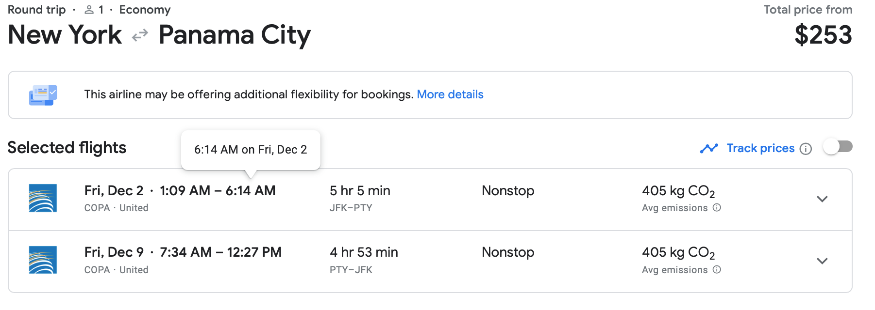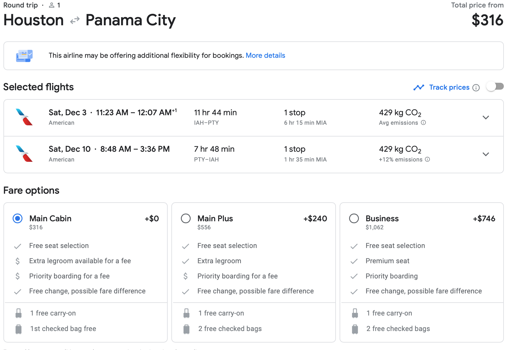Flights from Houston (IAH) to Panama are also drastically discounted with this deal. We found lots of availability for $316 round-trip main cabin fares on American in November and December. The catch is that most of the outbound flights we saw had a lengthy layover in Miami.