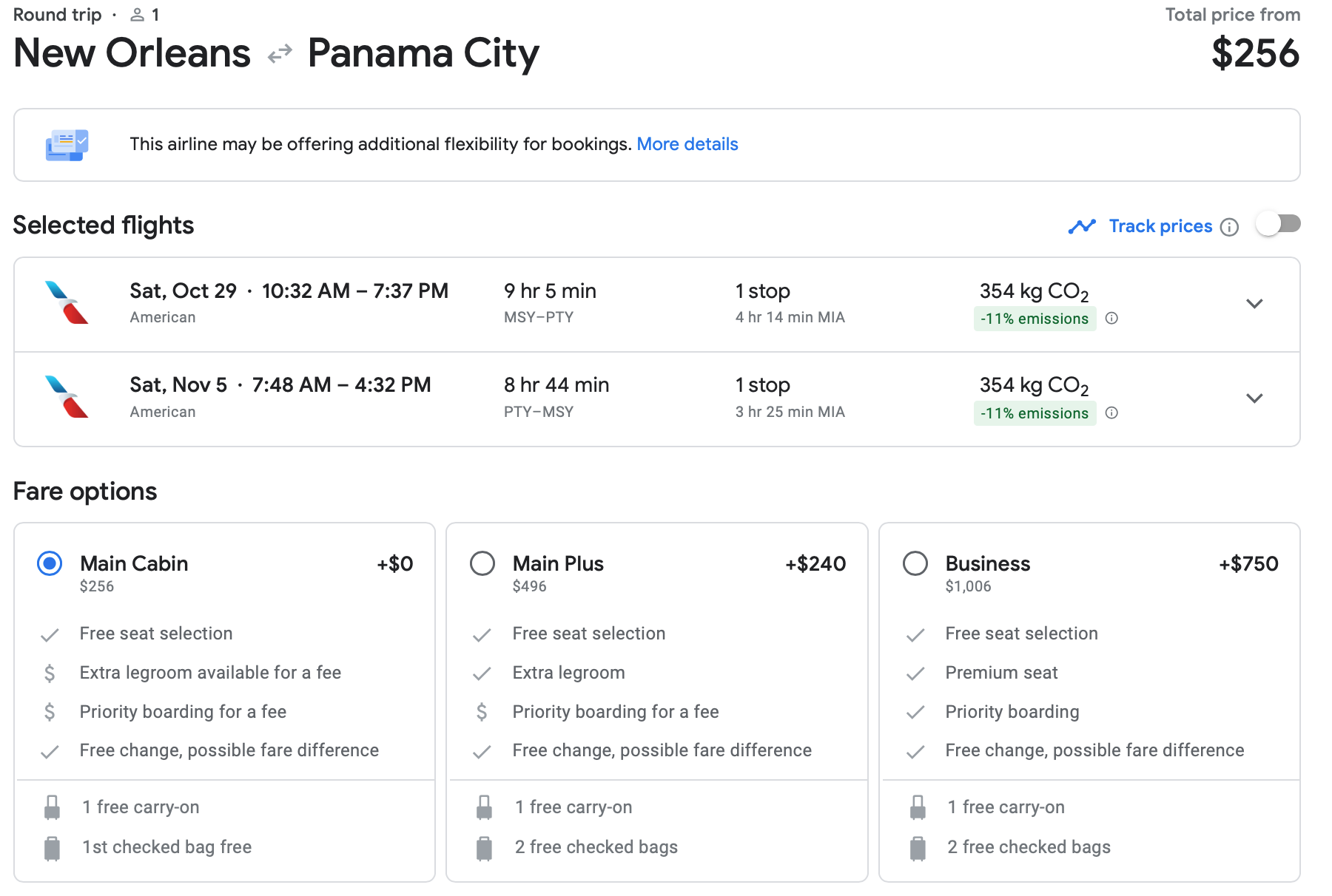 You can score a fantastic deal from New Orleans (MSY) to Panama City in the fall. This late-October itinerary on American is only $256 round-trip. We also saw this great price available for November travel. You have extended layovers in Miami, but the big savings for this fare should balance it out. Also, it's a main cabin ticket so you get the free carry-on and your first checked bag is free.