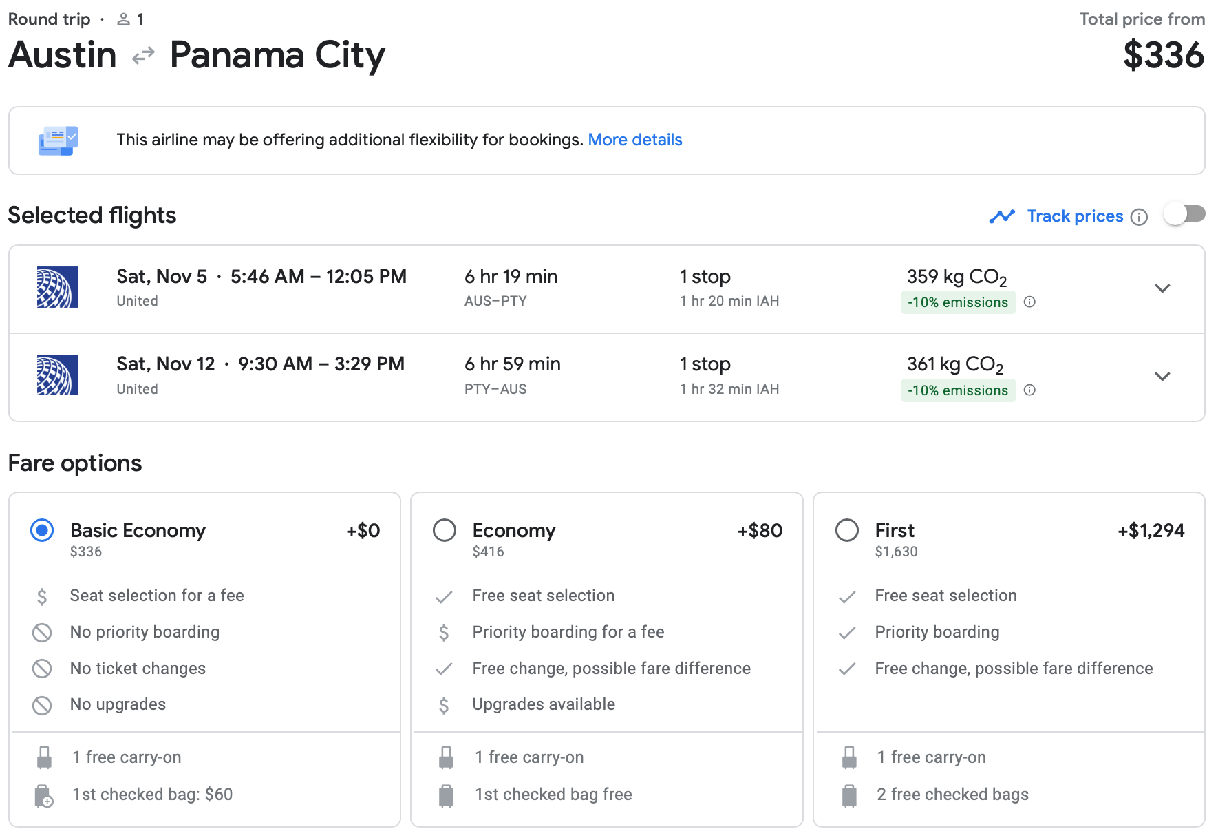 You won't have long layovers to deal with if you live in Austin. You can fly out of Austin-Bergstrom International Airport (AUS) to Panama in November for just $336 round-trip on United. It's a basic economy ticket so you do get a free carry-on bag.