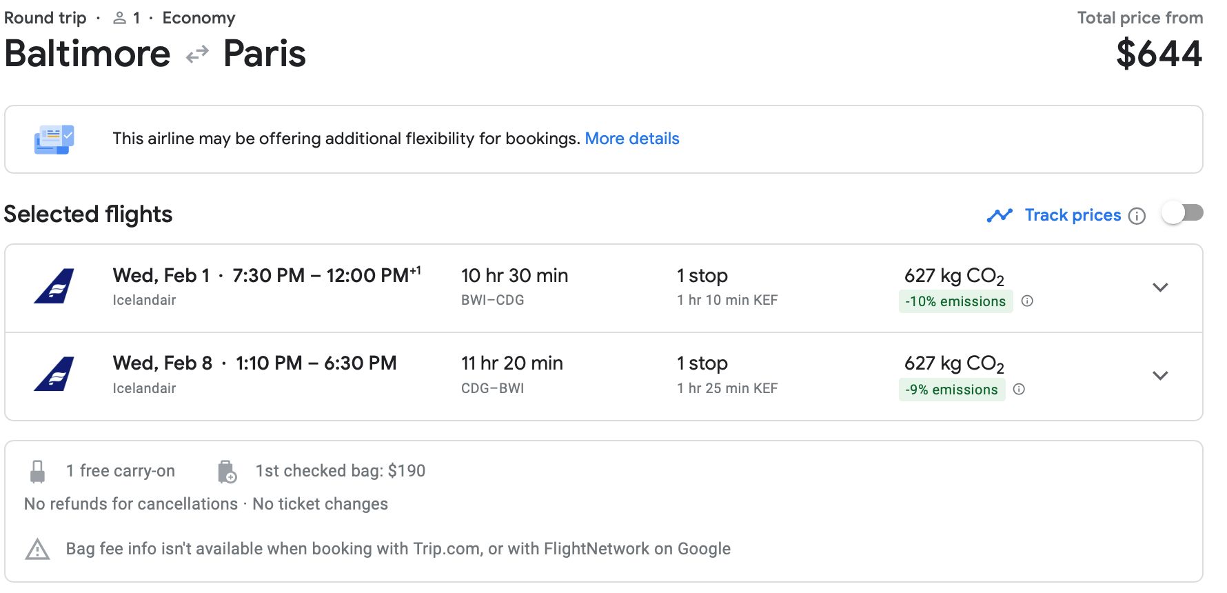 You can fly from Baltimore (BWI) to Paris in February for $644 round-trip on Icelandair. That's a nice price for this route. It comes with a free carry-on, but a checked bag will cost you nearly $200 so pack light.