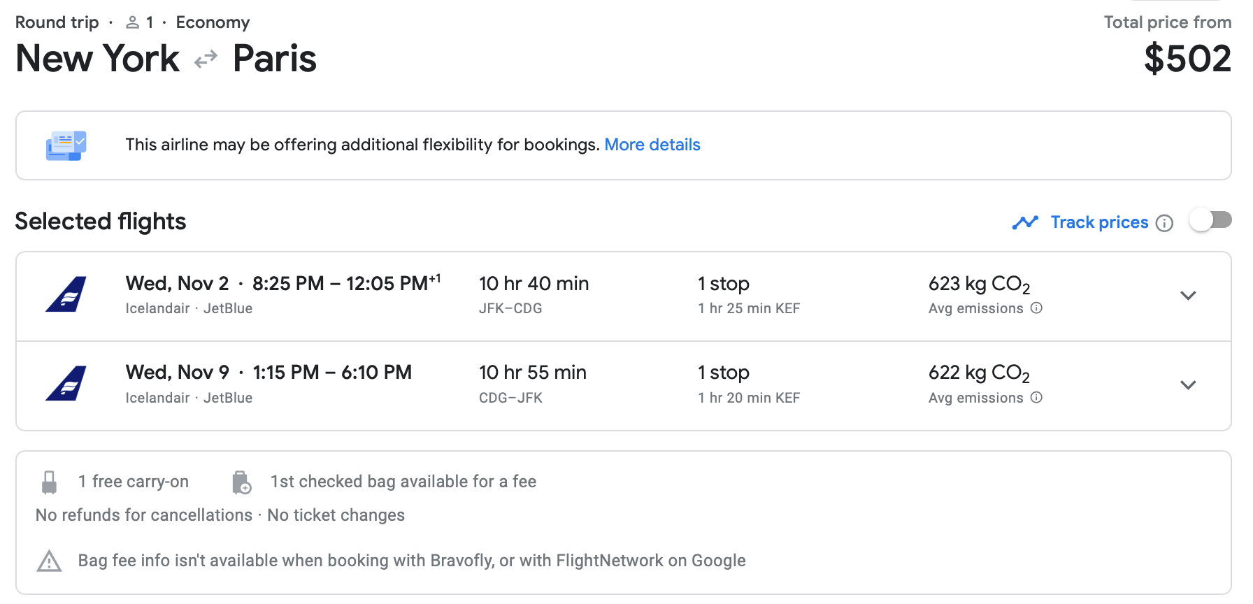 There is widespread availability for flights from New York City (JFK) to Paris at a discount. Icelandair has round-trip fares for $502 in November.