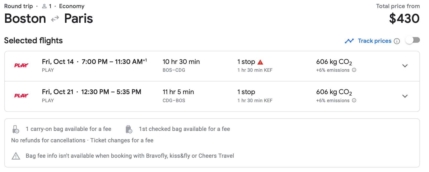 You can fly from Boston (BOS) to Paris for just $430 roundtrip on Play, which TPG has reviewed positively in the past. Keep in mind that this ticket does not come with a free carry-on. But still, that's quite a nice price for a flight to France.