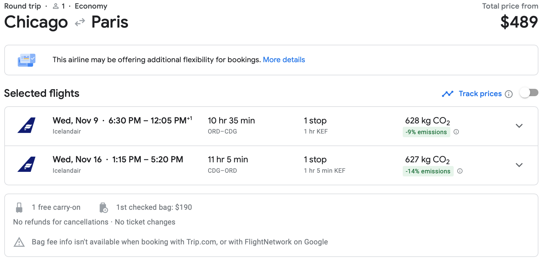 Here's one more sub-$500 fare, courtesy of Icelandair. You can fly from Chicago (ORD) to Paris for only $489 round-trip in early November.