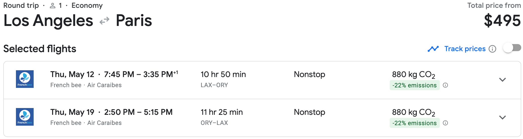 Travel dates: French Bee flights are for travel April-May; TAP flights are for travel October-February.