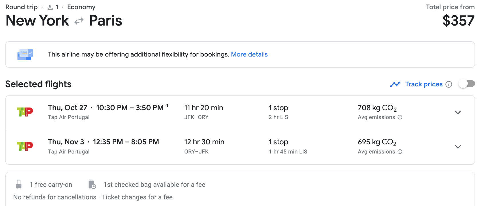 Check out this stellar fare from New York's John F. Kennedy International Airport (JFK) to Paris-Orly Airport (ORY) in late October for only $357 round trip. There is a layover in Lisbon each way, and as mentioned earlier, checked bags will cost extra. You do get a free carry-on so if you travel light, you can avoid the bag fees. Also, this ticket is almost $600 cheaper than normal for this itinerary.