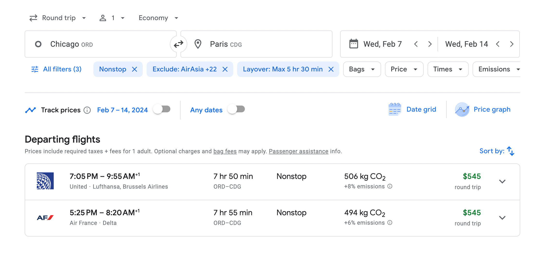 - Air France and United: O'Hare International Airport (ORD) to CDG, starting at $545.