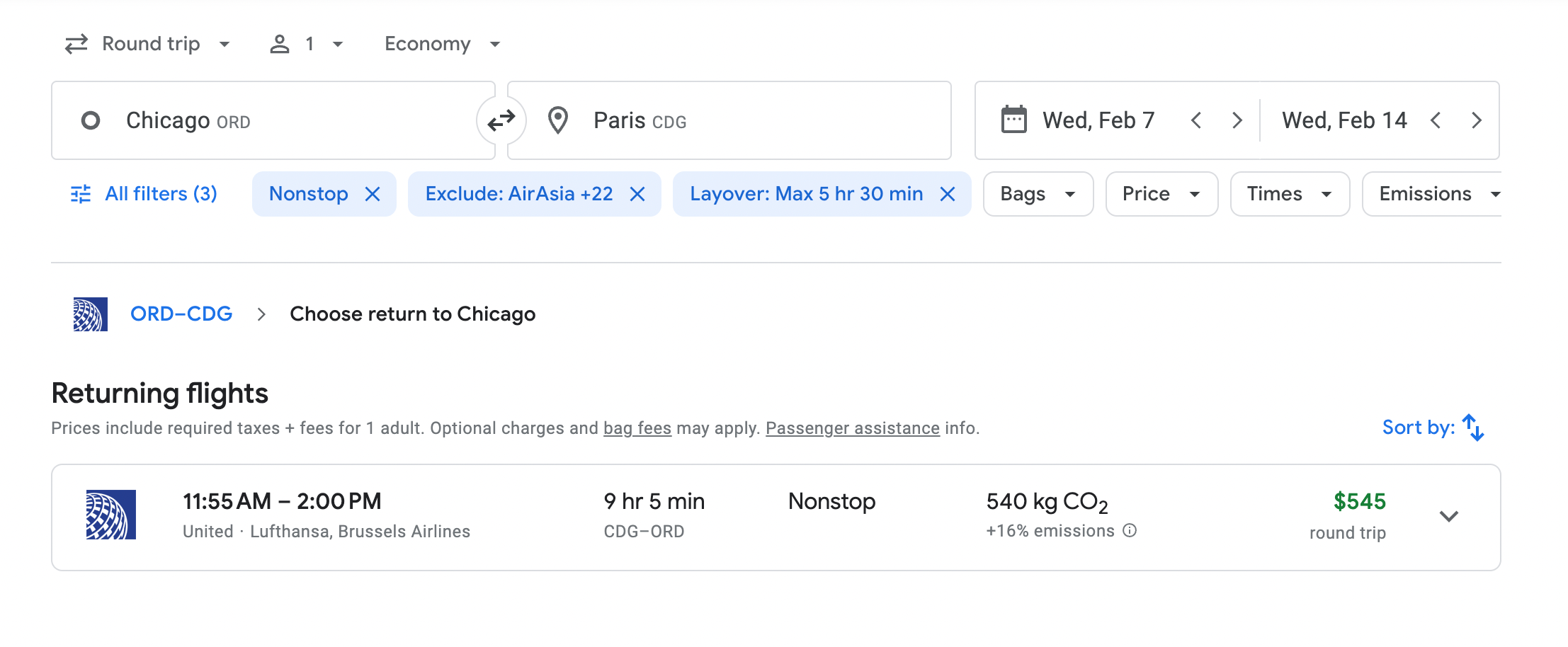 If you opt for United, the airline offers a returning flight from Paris at 11:55 a.m.