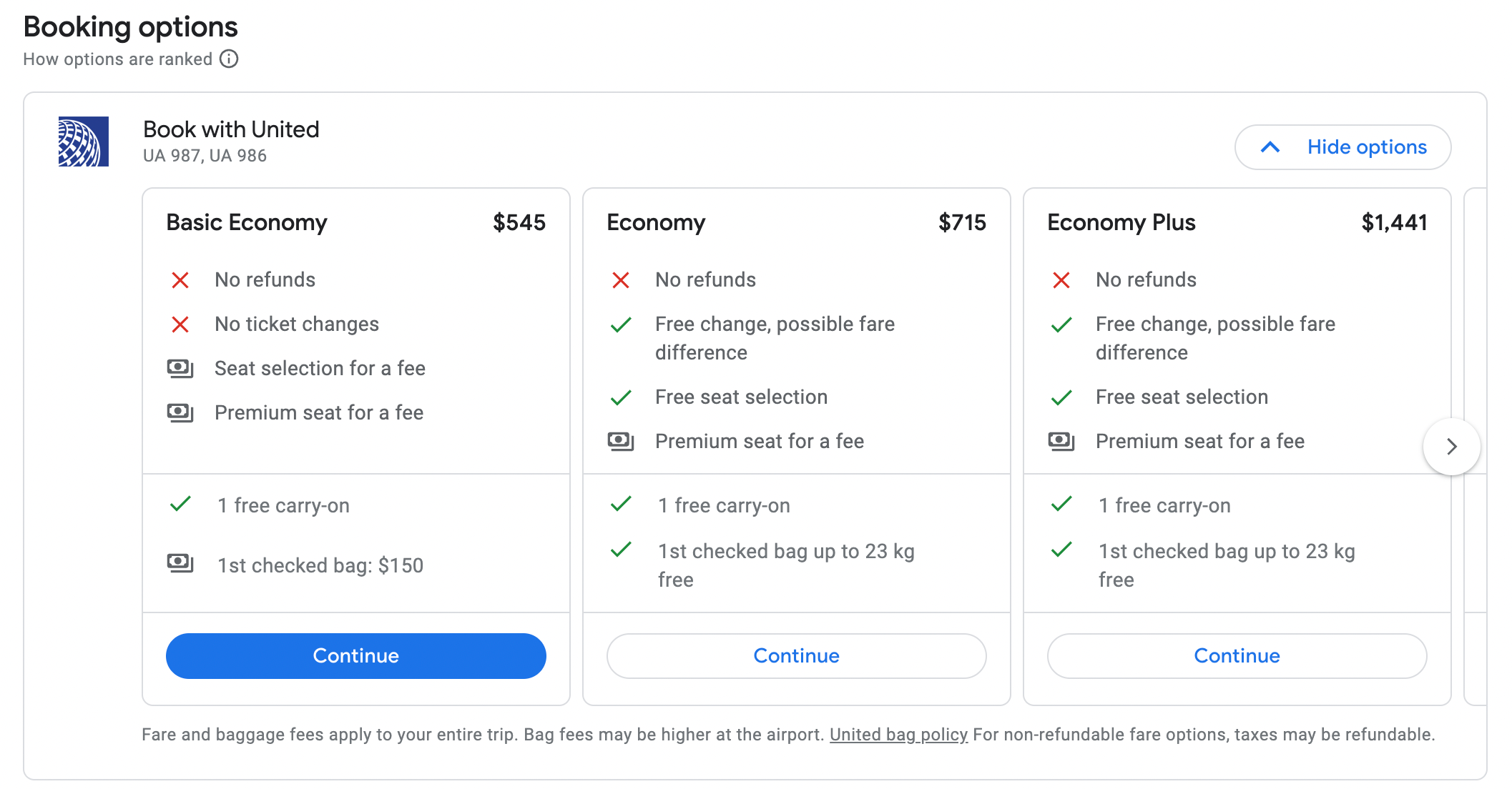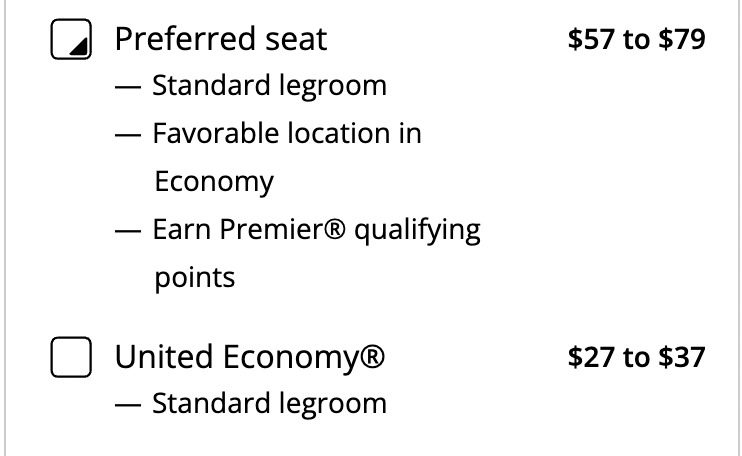 Selecting an economy seat will cost anywhere from $27 to $37, whereas if you want to fly in a preferred seat to earn Premier qualifying points as part of United's MileagePlus program, you'll pay anywhere from $57 to $79.