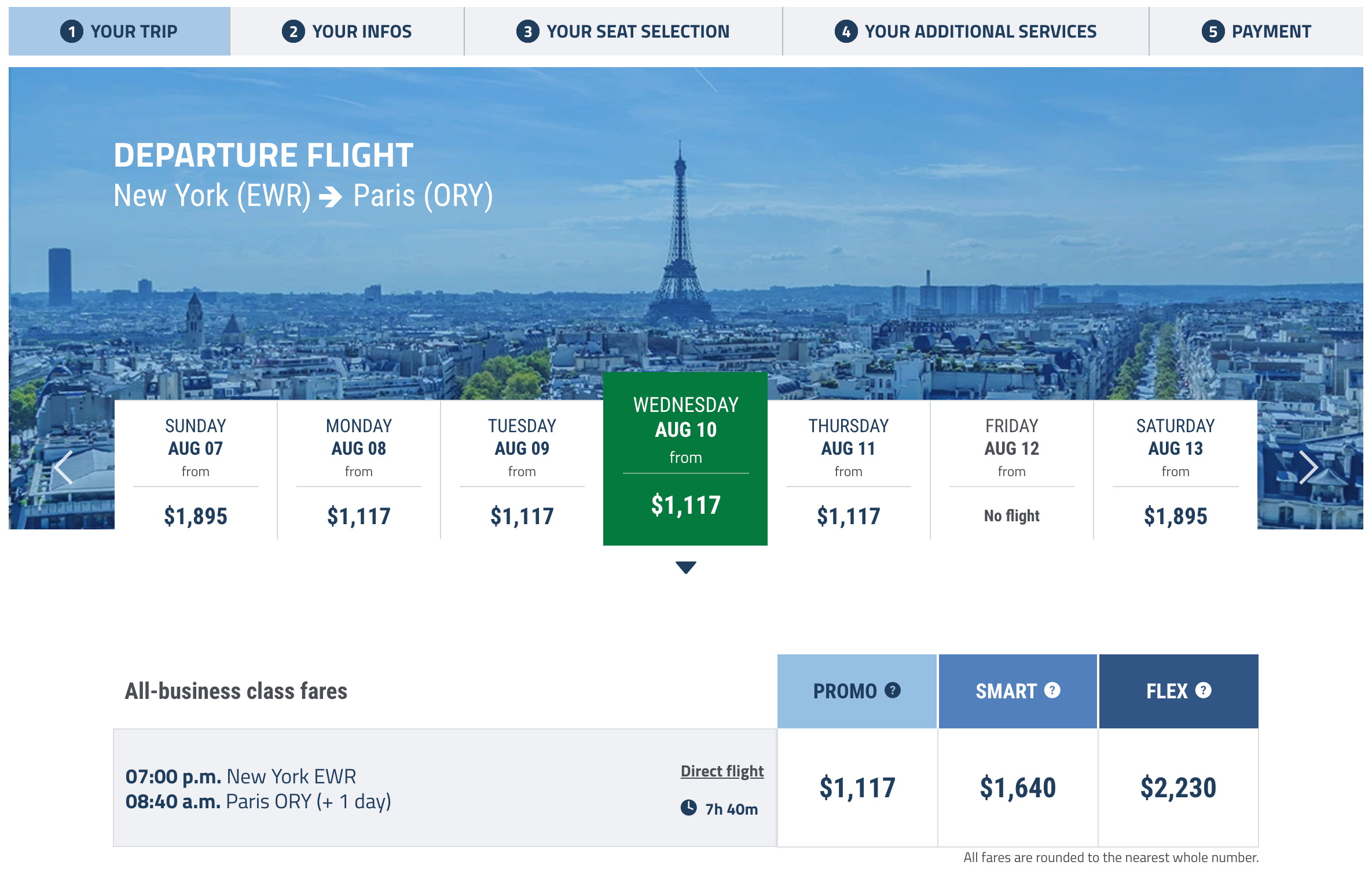 We searched for flights from EWR to ORY to get an idea of availability, looking at travel dates Aug. 10–Aug. 17, 2022.