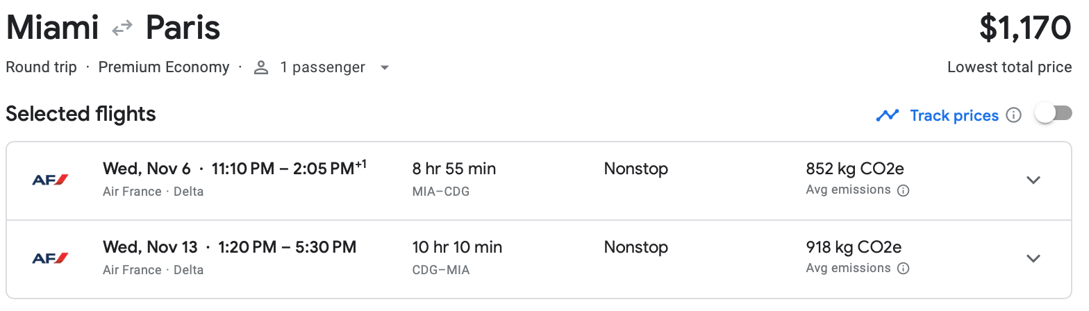 If you live in Miami, November is an excellent month to book a trip to the City of Light. Air France has nonstop options from MIA to CDG for $1,170. There is decent availability at this price in December, too.
