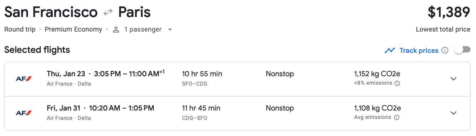 You can also fly Air France from SFO to CDG for less than $1,400 round-trip. That's a nice discount for this route, especially on a nonstop. The best availability we saw for these discounted fares out of San Francisco was in January and February.