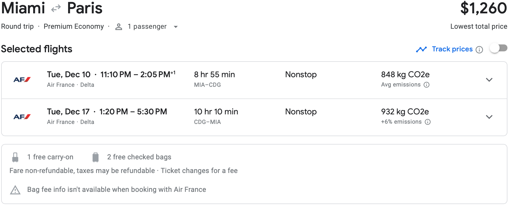 We saw lots of availability for flights from Miami to France in this deal, with the best prices available in December and January. This round-trip nonstop itinerary from Miami to Paris is $1,260 for premium economy.