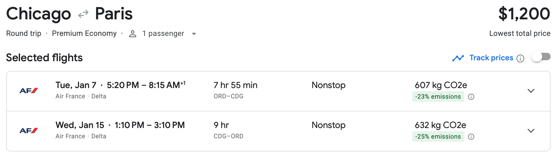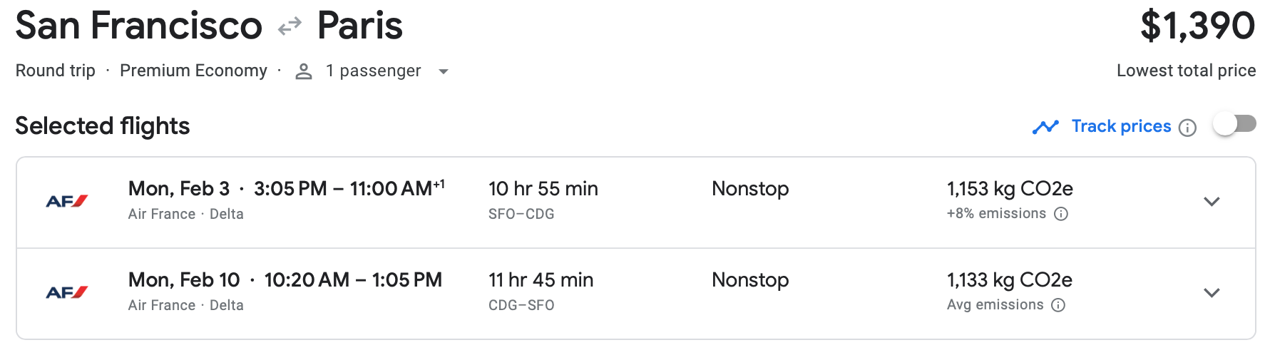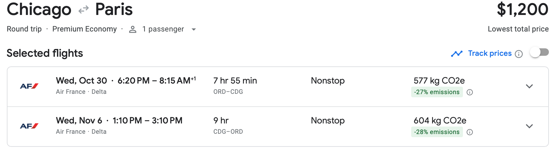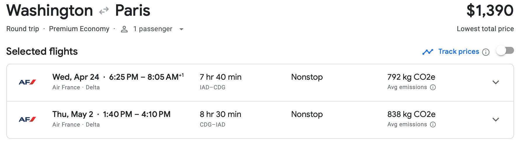 This Air France flight for a premium economy fare from IAD to CDG is available for $1,390. You can also find the same price for premium economy seats on this route in November and December.
