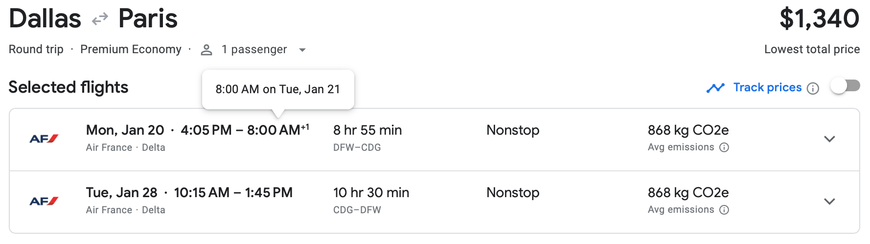 January is also the best time to book this deal if you live in Dallas. You book round-trip premium economy seats on flights in January out of DFW to Paris for $1,340.