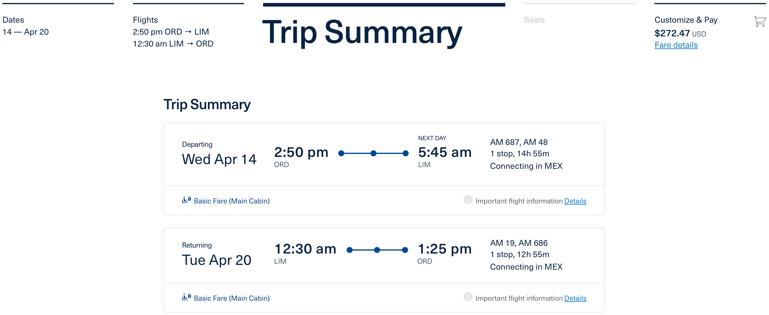 Chicago (ORD) to Lima (LIM) for $272 round-trip on Aeromexico:
