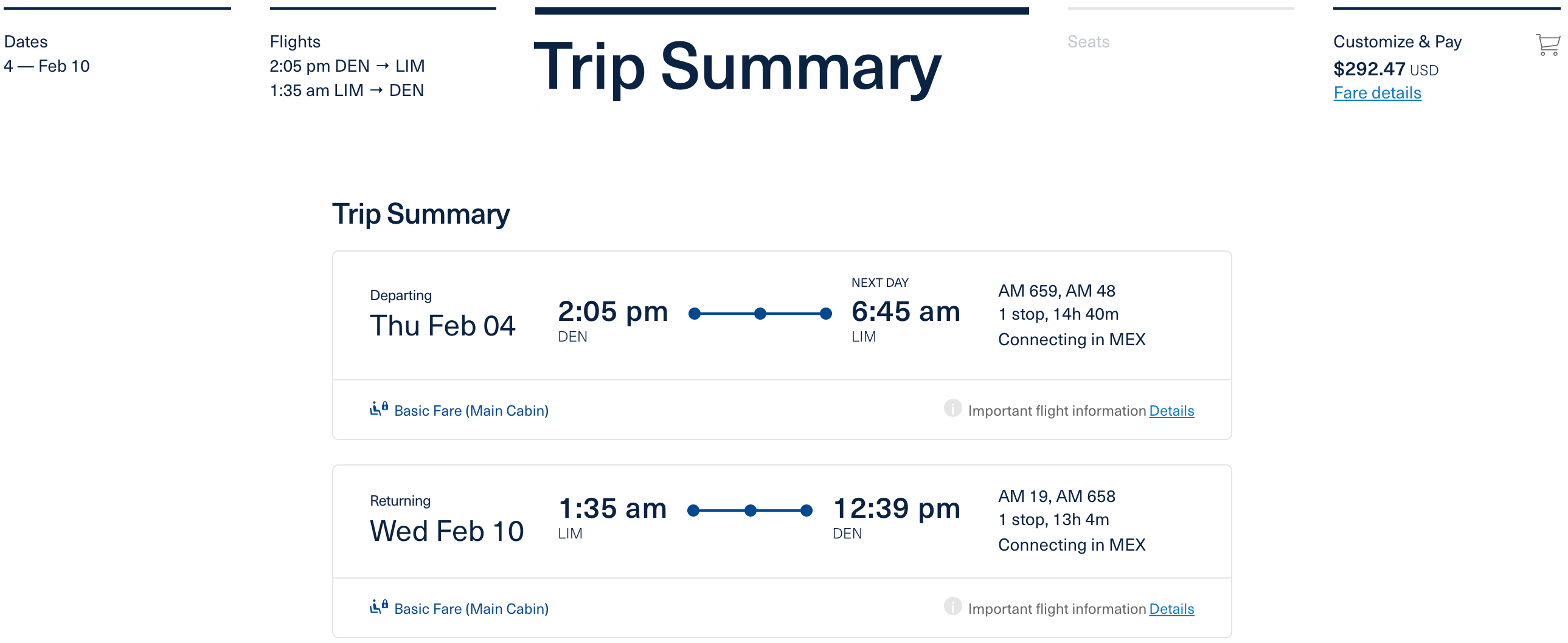 Denver (DEN) to Lima (LIM) for $292 round-trip on Aeromexico: