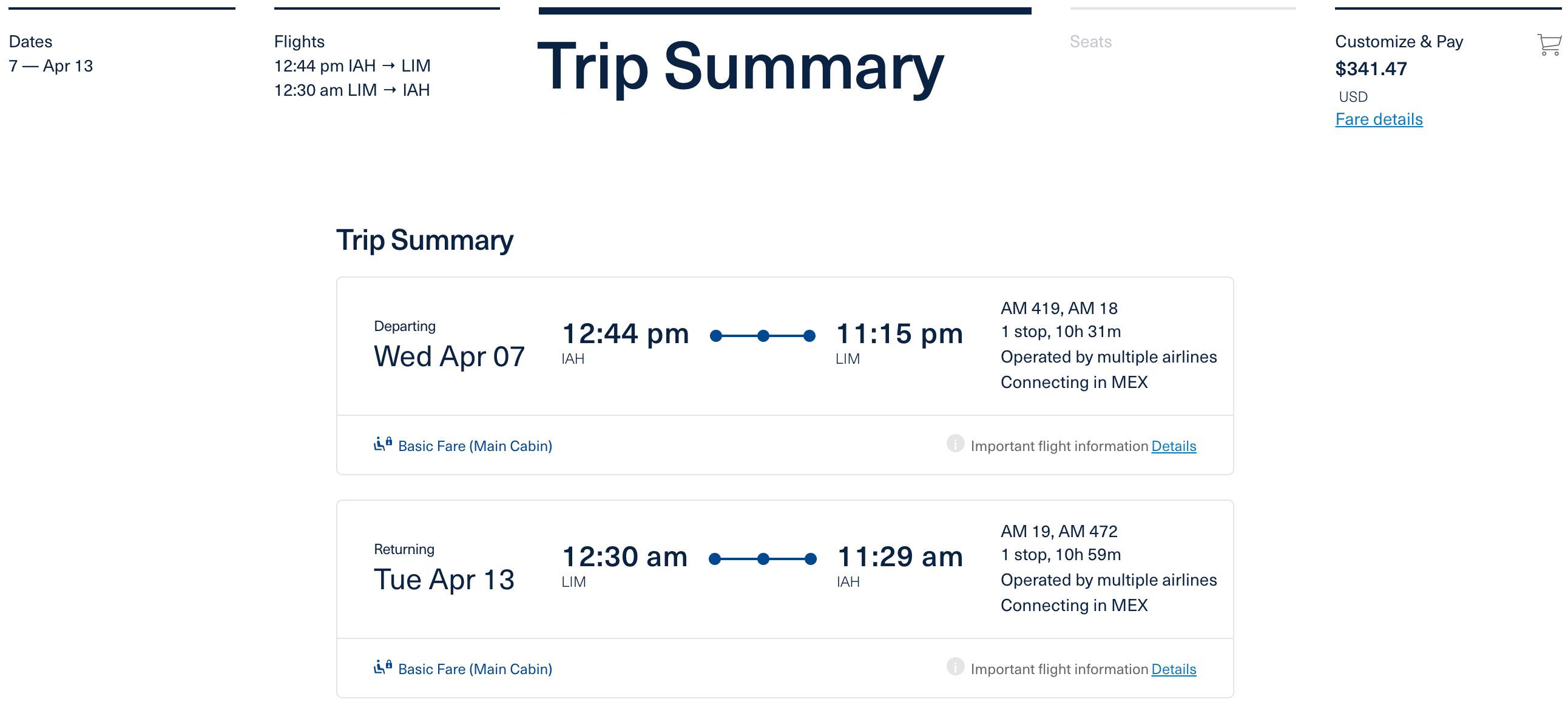 Houston (IAH) to Lima (LIM) for $341 round-trip on Aeromexico: