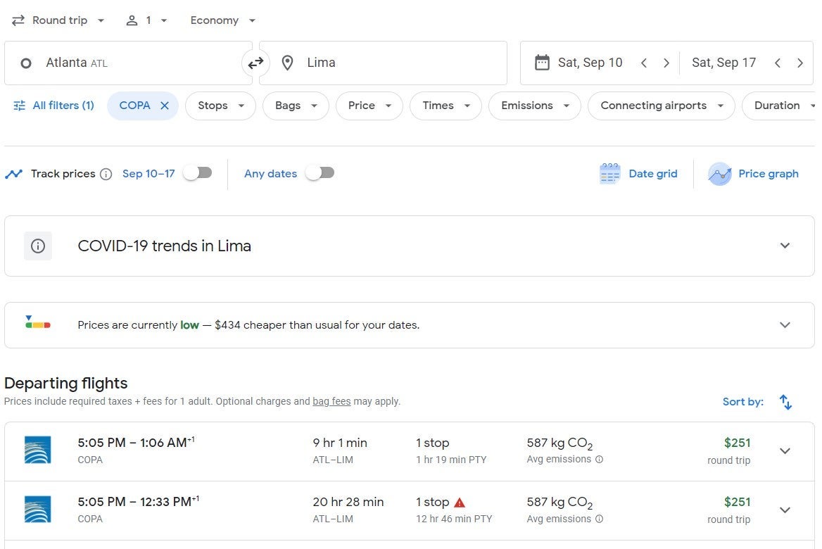 The cheapest flight we found is a $251 round trip from Hartsfield-Jackson Atlanta International Airport (ATL) to Lima's Jorge Chavez International Airport (LIM). According to Google Flights, this price is over $450 cheaper than usual for travel to Lima in September. There is a 12-hour overnight layover in Panama City, so if you're booking this particular flight you'll likely need a hotel there.